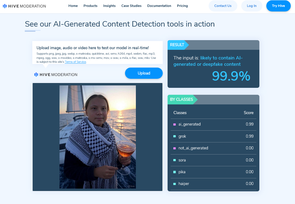 To verify, the image was uploaded to Hive Moderation, an AI-content detection platform. It returned a 99.9% probability that the image was AI-generated or deepfake.