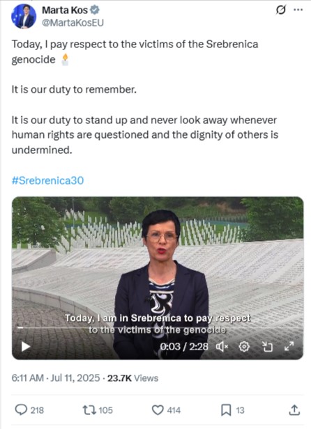 Commissioner Kos shared a video post on X (archived) on the occasion of the 30th anniversary of the Srebrenica genocide, accompanied by the caption: