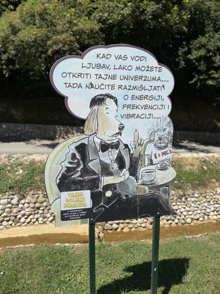 On “Tesla Square” stands a statue of the famous scientist, while inspirational and spiritual messages are scattered throughout the park. “When you are guided by love, you can easily uncover the secrets of the universe,” proclaims a cartoon dog, Nikola Tesla, wearing a bow tie and holding a dove, while across the table, another dog with wild hair and a T-shirt bearing Einstein’s famous equation of relativity looks at him.