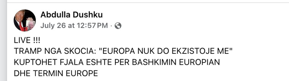 At the end of July 2025, during a visit to Scotland, Trump stated ‘When it comes to immigration, you have to act fast. Otherwise, you won’t have Europe anymore‘. This particular phrase, “You won’t have Europe anymore”, has been taken by Facebook users as a warning of a catastrophic change to the European Union’s structure. In fact, Trump’s comment was meant as a criticism of European immigration and refugee policies, a nod of support to right-wing parties in Europe, and not a prediction of the EU’s collapse. He went on to maintain the same tone, speaking of a “horrible invasion” and blaming immigration for “killing Europe.”