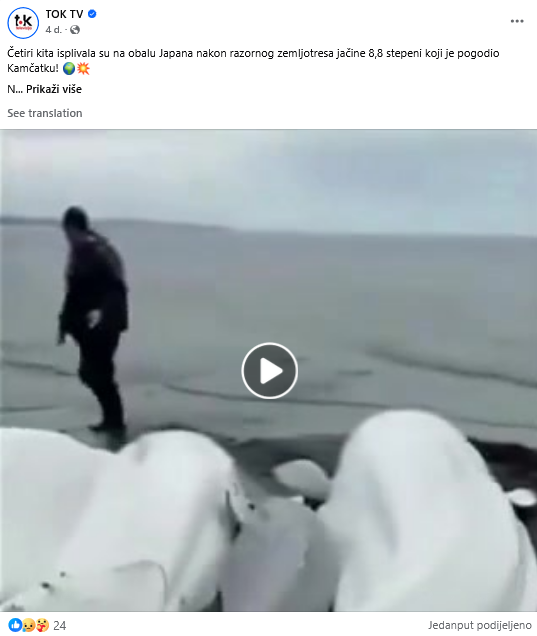 The one-minute video shows several beluga whales stranded on a shore, while people walk along the edge of the sea, attempting to assess the situation and help the animals. Using Google Lens to reverse-search video stills, we found that the same footage has been circulating across various platforms and is now being falsely associated with the magnitude 8.8 earthquake that struck Russia’s Kamchatka Peninsula and Kuril Islands on 30 July 2025.