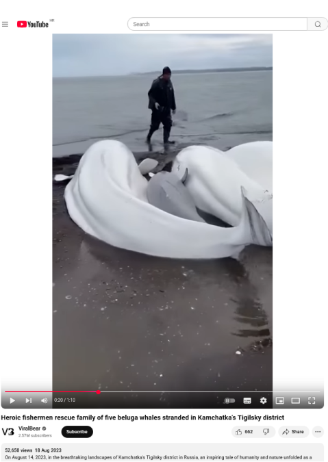 The footage was recorded in 2023, when local fishermen in Kamchatka rescued beached beluga whales and helped return them to the sea.