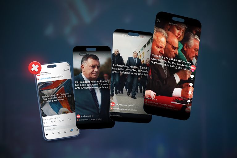 Raskrinkavanje covered the Know More accounts on X, TikTok, and Instagram, as well as the Kritična masa Facebook page, in a July 2025 analysis titled “Propaganda Campaign on Social Media: Demonization of the High Representative and Glorification of Milorad Dodik”.