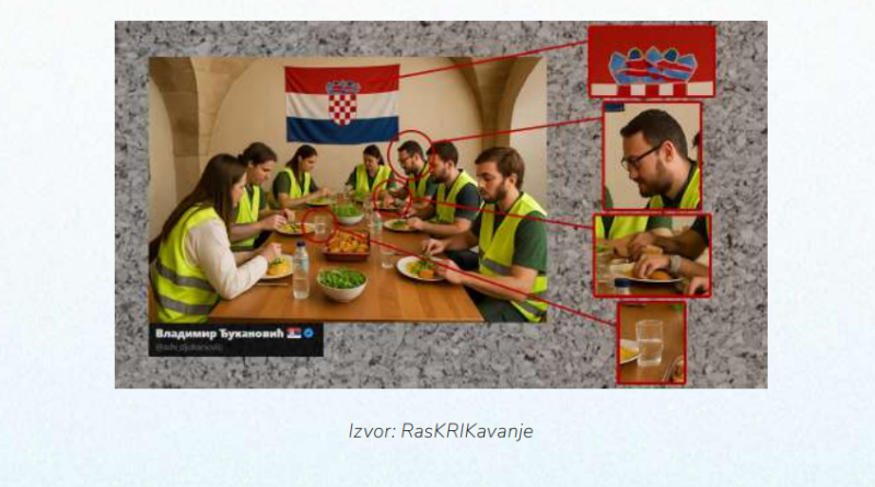 In Serbia, the situation is somewhat different. RasKRIKavanje states that during their work, they mostly recorded AI content of a local character, i.e. it concerned the current events in Serbia. For example, a representative of the ruling party posted in April an AI-generated photo with the intention of discrediting students participating in the blockade, which shows students eating at a table, a large Croatian flag hanging above them. In just a few hours, this post reached over 11000 views, 120 shares and more than 200 likes, according to an article on RasKRIKavanje.