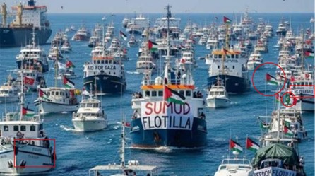 The article included a photograph showing a group of ships with Palestinian flags and the signs Sumud Flotilla and Aid for Gaza. The caption under the photo stated that it depicted Humanitarian flotilla Sumud carrying aid for Gaza, with Facebook cited as the source.