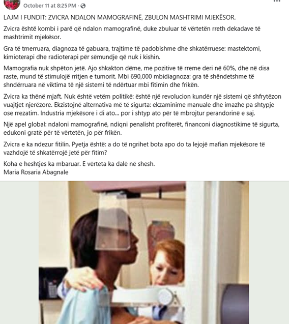 The claim may stem from a 2014 report by the Swiss Medical Board, now repealed, which questioned the benefits of mammography and suggested discontinuing its use.