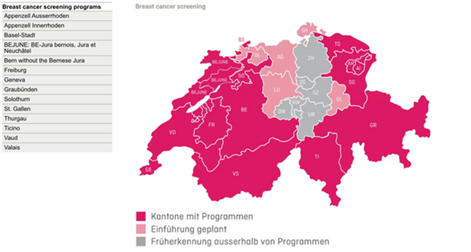 Websites of the Swiss Cancer Screening Association and the Swiss Cancer League indicate that eight out of ten women are at least 50 years old when diagnosed with breast cancer. This type of cancer is also the most common and deadly among women, with about 6,600 new cases identified each year in Switzerland. Early detection of breast cancer increases the likelihood of successful treatment. As of the time of writing, Switzerland provides systematic mammography services in most cantons nationwide, as shown on a map on the Swiss Cancer Screening Association website.