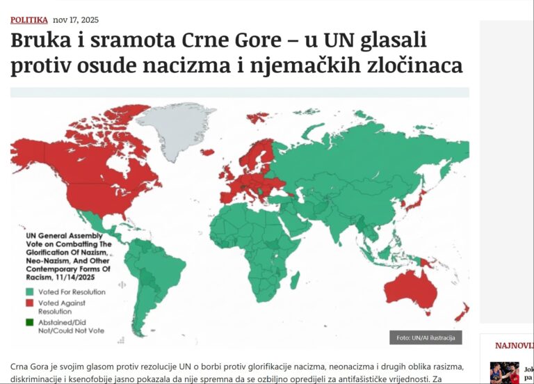 “By voting against the UN resolution on combating the glorification of Nazism, neo-Nazism and other forms of racism, discrimination and xenophobia, Montenegro has clearly shown that it is not ready to seriously commit to antifascist values. The resolution was supported by 114 states, 52 voted against, and 11 abstained. Among European countries, only Serbia and Belarus supported the Russian initiative – Montenegro took the opposite side. Serbia’s vote represents a clear commitment to antifascism and the preservation of the memory of the victims of fascism, while Montenegro shows how empty declarative statements about antifascism are when substantive decisions are made,” the Borba article states (archived here).