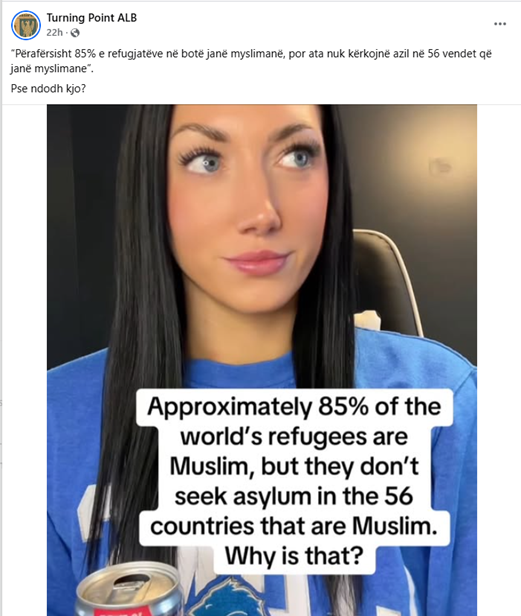 Across social media, including Albanian-language platforms, a claim is circulating that approximately 85% of the world’s refugees are Muslims, but they do not seek asylum in 56 Muslim countries.