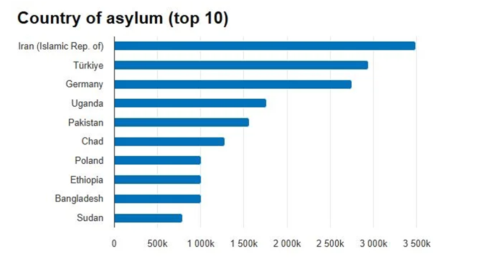 UNHCR data from 2024 shows that in that year, Iran and Turkey, two Muslim-majority countries, hosted 6.4 million refugees (3.5 million and 2.9 million, respectively), mostly from Afghanistan and Syria. Other countries hosting large numbers of refugees included Colombia and Germany (2.8 and 2.7 million, respectively), both majority-Christian countries, followed by Uganda, Pakistan, and Chad, with the latter two being Muslim-majority.