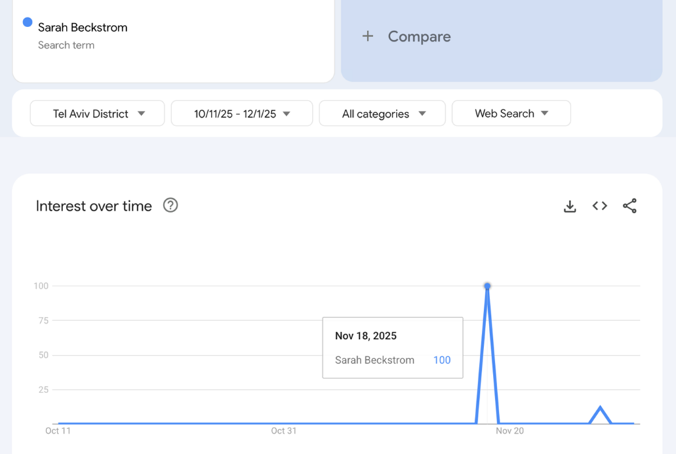Furthermore, these claims rely on a fundamental misunderstanding of how Google Trends functions. Research has shown that Google Trends is not a reliable tool for such analysis, as the data it provides is not always accurate. Both Allen and Inside Over searched for the name “Sarah Beckstrom” without using quotation marks. In such cases, Google includes results containing the words “Sarah” and “Beckstrom” in any order or combination, not only as the full name. This can lead to misleading results, as shown in the graph below, where the name Sarah Beckstrom appears to have been searched in Tel Aviv on November 18, nearly a week before the attack.