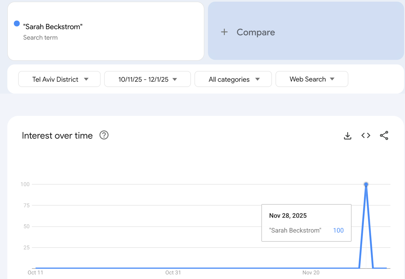 Furthermore, these claims rely on a fundamental misunderstanding of how Google Trends functions. Research has shown that Google Trends is not a reliable tool for such analysis, as the data it provides is not always accurate. Both Allen and Inside Over searched for the name “Sarah Beckstrom” without using quotation marks. In such cases, Google includes results containing the words “Sarah” and “Beckstrom” in any order or combination, not only as the full name. This can lead to misleading results, as shown in the graph below, where the name Sarah Beckstrom appears to have been searched in Tel Aviv on November 18, nearly a week before the attack.