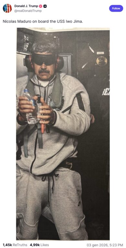 In addition, the image was not shared by U.S. President Donald Trump’s account or by any other organization or U.S. government official. Trump posted a photo of Maduro after his capture, where he appeared dressed completely differently, wearing a gray Nike tracksuit.