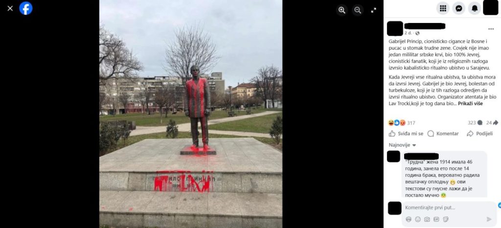 On 26 January, a Facebook user posted a photograph of a monument to Gavrilo Princip splashed with red paint and accompanied it with a claim that the Sarajevo assassin of Archduke Franz Ferdinand and his wife Sophie was actually named “Gabriel,” that he was Jewish, and that he was a Zionist fanatic.