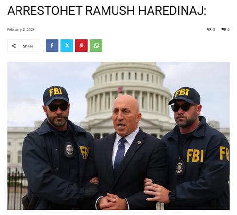 Following this visit, news circulated on social media and Albanian-language portals claiming that Haradinaj had been arrested at Capitol Hill by the FBI. The news was accompanied by an image that shows Haradinaj escorted by two FBI agents.