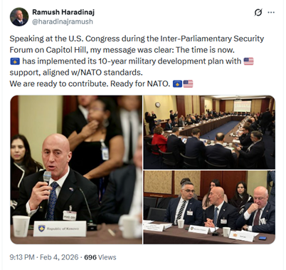 At the beginning of February 2026, the former Prime Minister of Kosovo and Leader of the Alliance for the Future of Kosovo (AAK), Ramush Haradinaj, started an official visit to the USA.
