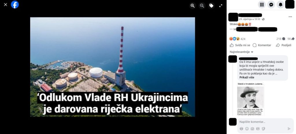 On 23 January, a Croatian Facebook user posted a screenshot bearing the headline: “By decision of the Government of the Republic of Croatia, the Rijeka power plant has been donated to Ukraine.”