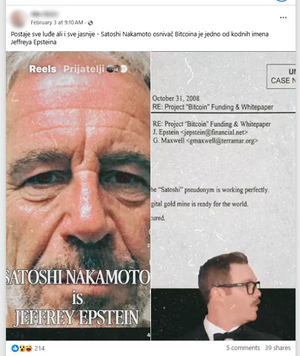 In a Facebook post published on February 3, 2026, one profile claimed that Satoshi Nakamoto was “one of Jeffrey Epstein’s codenames”. Satoshi Nakamoto is the pseudonym widely believed to be used by the creator of the cryptocurrency bitcoin.