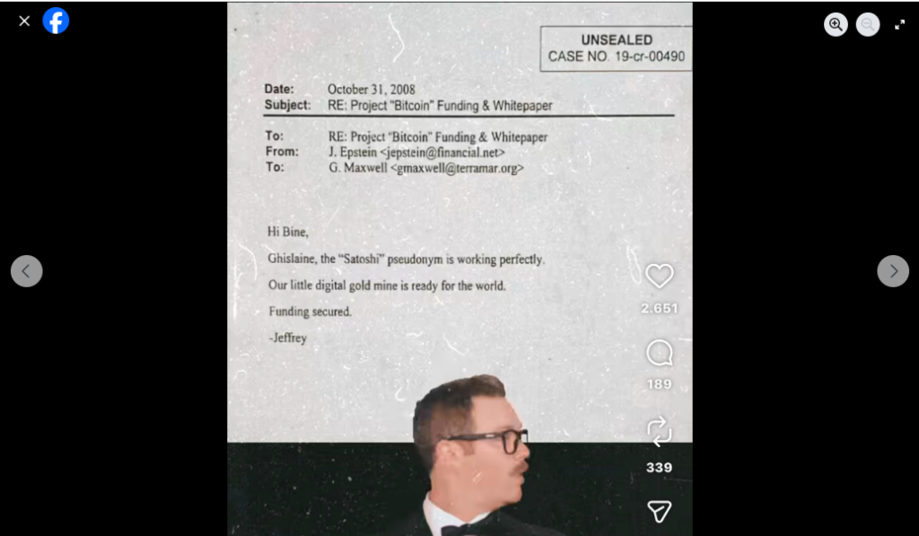 As “evidence,” the post shared a screenshot of an alleged email exchange in which Epstein tells his associate Ghislaine Maxwell that “the Satoshi pseudonym works perfectly” and that “our little digital gold mine is ready for the world”.