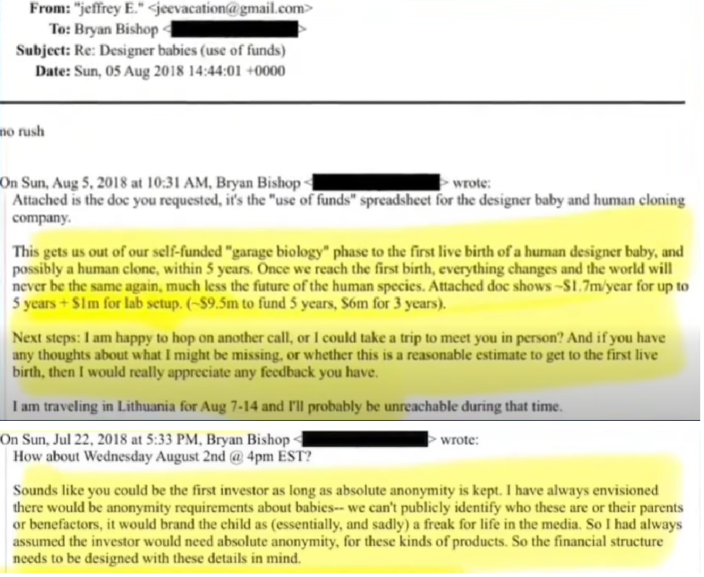 The emails shown in the video were sent to Epstein in 2018 by Bryan Bishop, a self-described “biohacker,” programmer, and entrepreneur who was an early investor in bitcoin. Bishop believed that the human race could be “improved” through technology. Since he was not a scientist, he attempted to realize his vision by founding a start-up company that would produce “designer babies” through genetic modification of sperm – an idea that media reported on, back in 2019.