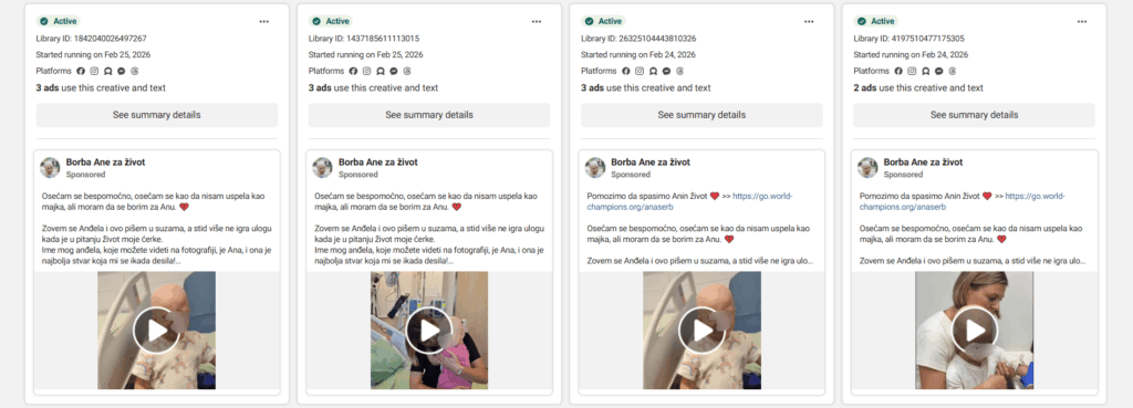 The page “Ana’s fight for life” was created on December 16 last year. According to data from Meta’s ad library, the primary locations from which the site is operated are Israel and Portugal. More than a dozen advertisements for this scam in Serbian are currently targeting citizens through five Meta platforms.