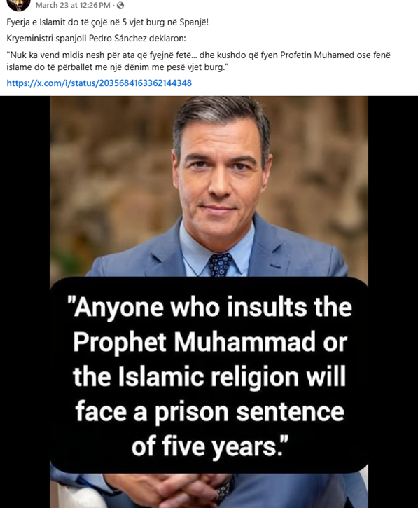 On social media, including Albanian-speaking platforms, a claim is circulating that Spain will sentence people to 5 years in prison for insulting the Muslim faith, accompanied by an alleged quote from Spanish Prime Minister Pedro Sanchez.
