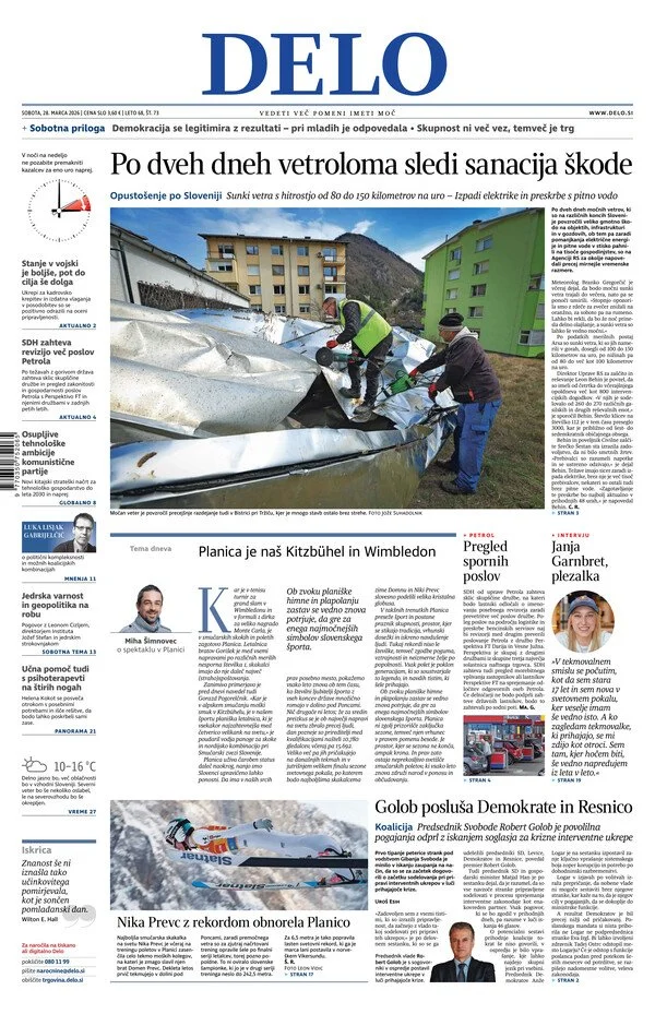 The front page of Delo dated 28 March does not match the image shared in the post. On that day the newspaper’s front page carried a story about the start of repairs following damage caused across much of Slovenia this year by a storm with strong winds. In the circulated image, the year of publication is written in Roman numerals, whereas Delo uses Arabic numerals. The issue number (136) shown on the purported front page does not correspond to the chronological sequence of the newspaper’s actual publications this year.